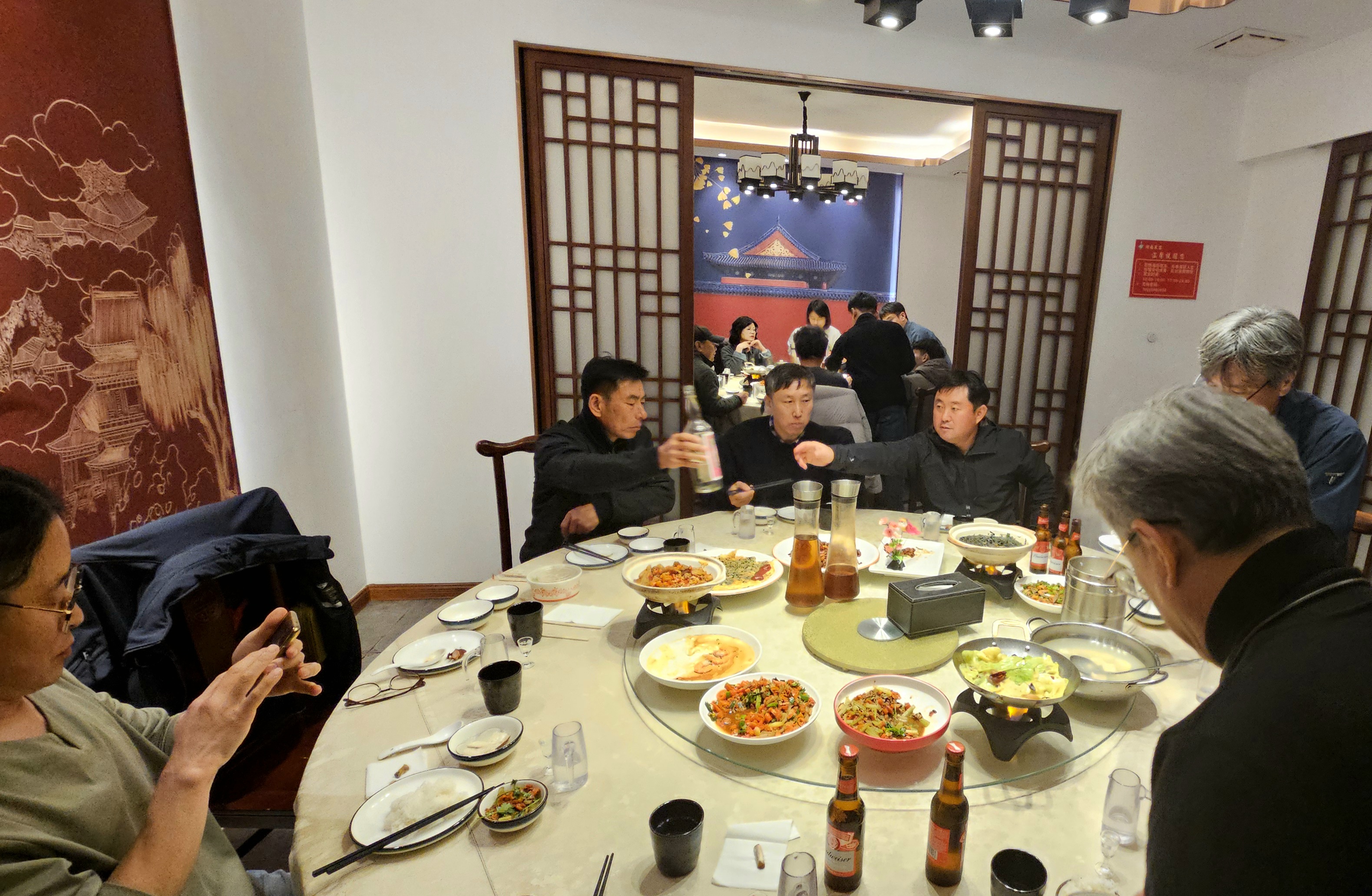 이미 음식이 차려진 식탁에 빙 둘러앉아 저녁을 먹었다. 자리에 앉고 보니 자연스럽게 주류, 비주류가 나누어졌다. 이번에도 기름진 음식이 대부분이지만 청두(성도), 여강(리장) 여행 때보다 다들 잘 먹었다. 원래 고량주는 먹지 않는데 이번에는 연태 고량주라고 해서 조금 맛을 봤다. 나만이 느끼는 건인지는 모르겠지만 고량주의 특유에 향이 싫다. 칵~ 본드 냄새가 코를 찌른다.
