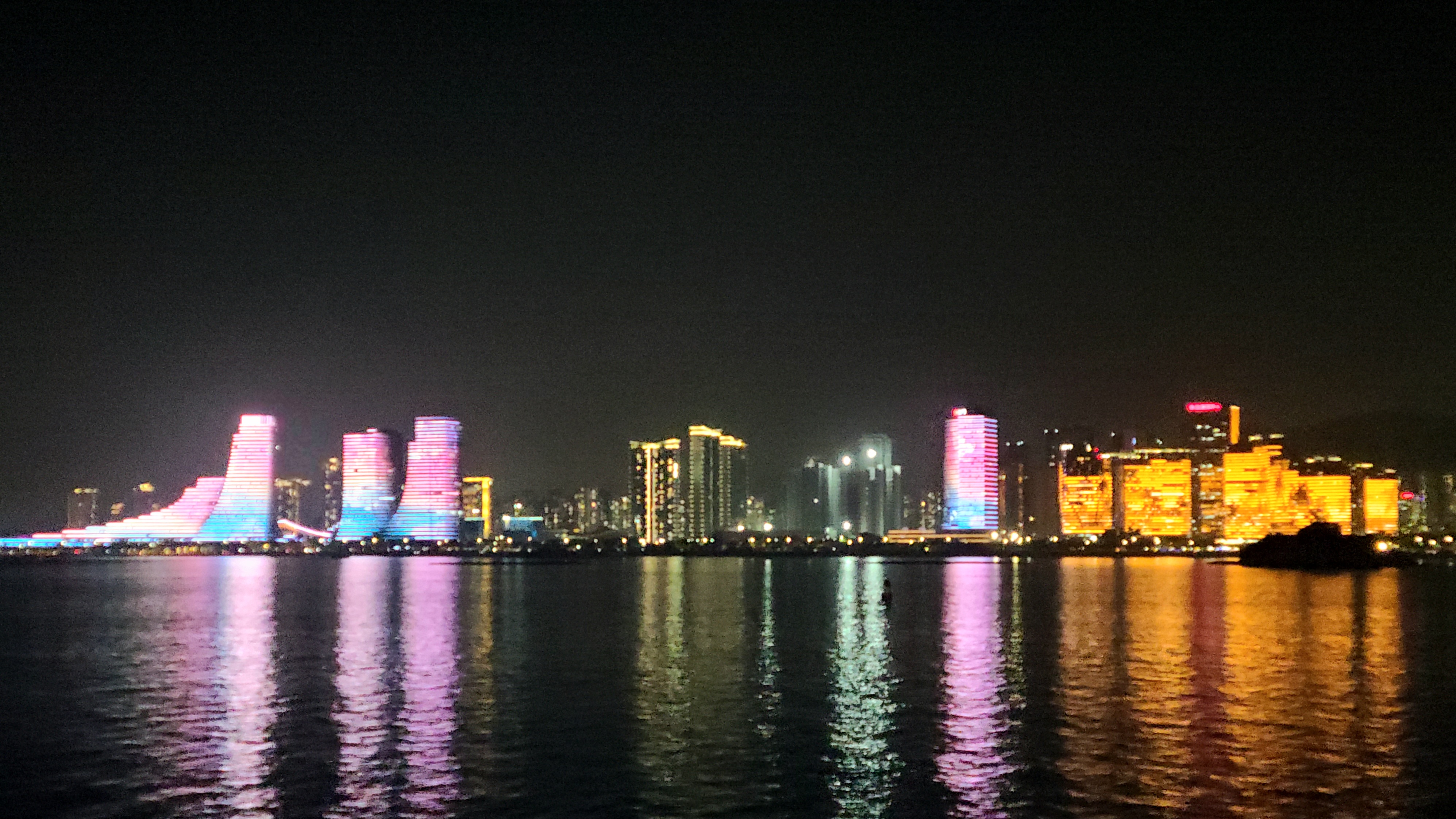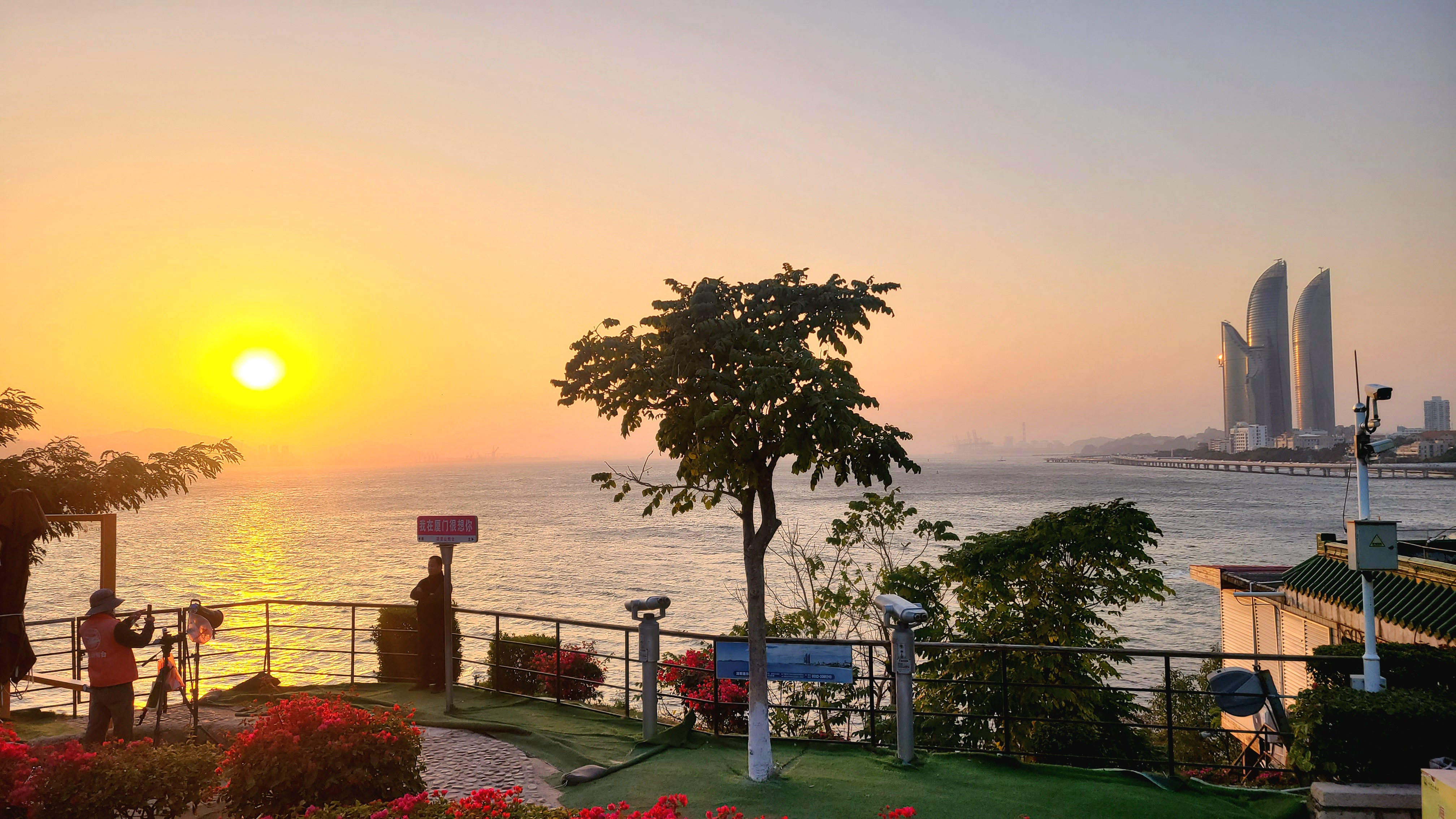 어느덧 해는 수평선 너머로 넘어가면서 멋진 석양을 연출하고 있었다. 저 멀리 해안가에 우뚝 솟은 샤먼의 랜드마크인 쌍둥이 빌딩이 자리하고 있었다. 아름다운 색감이 하늘에 물들고 그 빛이 바다에 서서히 드리워지며 한 폭의 풍경화를 탄생했다.