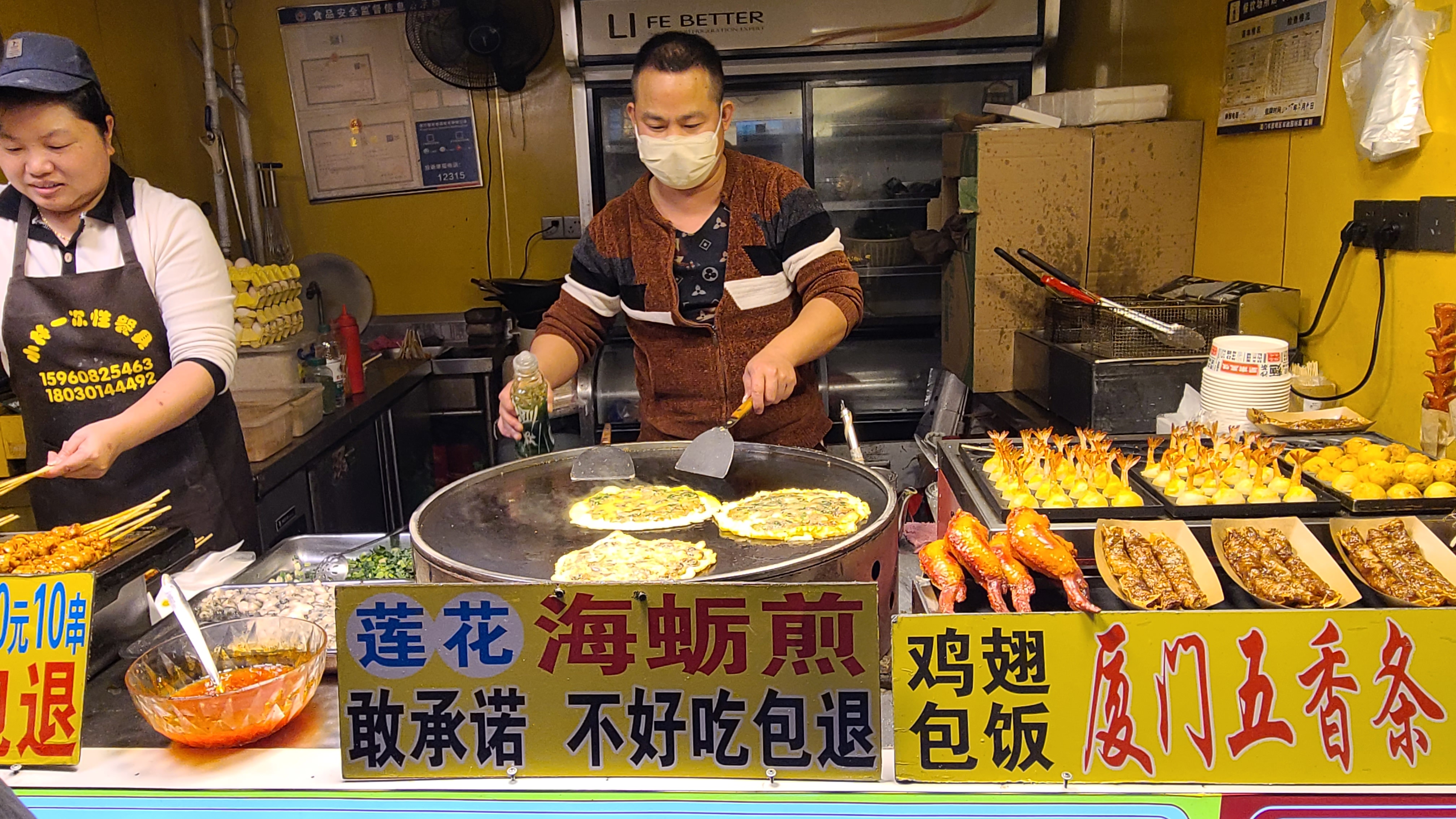 주어진 시간이 많지 않아서 굴전만 맛보기로 했다. 대화가 통하지 않으니 줄을 선 건지조차 알 수가 없었다. 일단 돈을 내고 손가락으로 2개를 표시한 후 잔돈을 받았다. 그때부터 할 수 있는 것은 굴전을 줄 때까지 쳐다보고 있는 수밖에 없었다. 그렇게 정성스럽게 굴전을 부치는 것이 아닌데 하나씩 만드는 것을 보고 있자니 가슴이 답답했다. 마침내 굴전 2개를 받고 여러 명이 나누어 먹었다. 배가 무척 고팠는데도 그렇게 맛있지는 않았다. 입맛 버렸네.